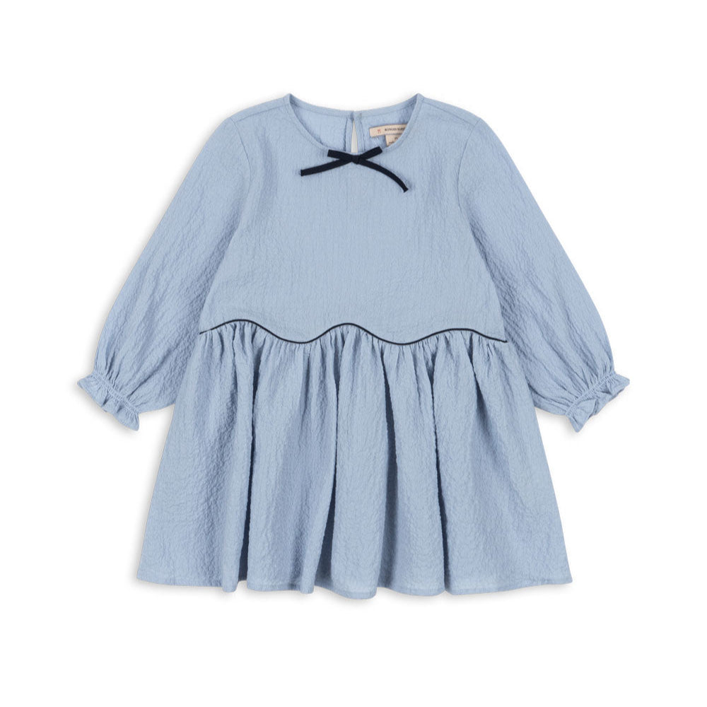 The blue dress from Konges Slojd that does it all, and will be your little one's favourite pick. With beautiful wavy detailing on the waistband and a little bow at the neckline, this dress is full of character. The skirt is full, which means your little one can do all the twirling and look even more stunning whilst doing so. It has long sleeves with fine elastic edges, and a loose fit to make for the most comfortable and stylish dress for any occasion.
