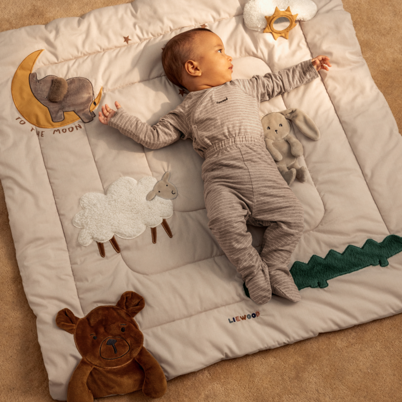 This beautifully crafted quilted playmat is the perfect addition to your little one's nursery. Featuring different shapes and textures, including crinkly fabric, a mirror element, and an attached silicone teether, perfect for stimulation and motivates babies to explore and strengthen sensory development This square quilted playmat has a light padding, perfect for tummy time with babies or for time out for older ones with a good book or screen time.