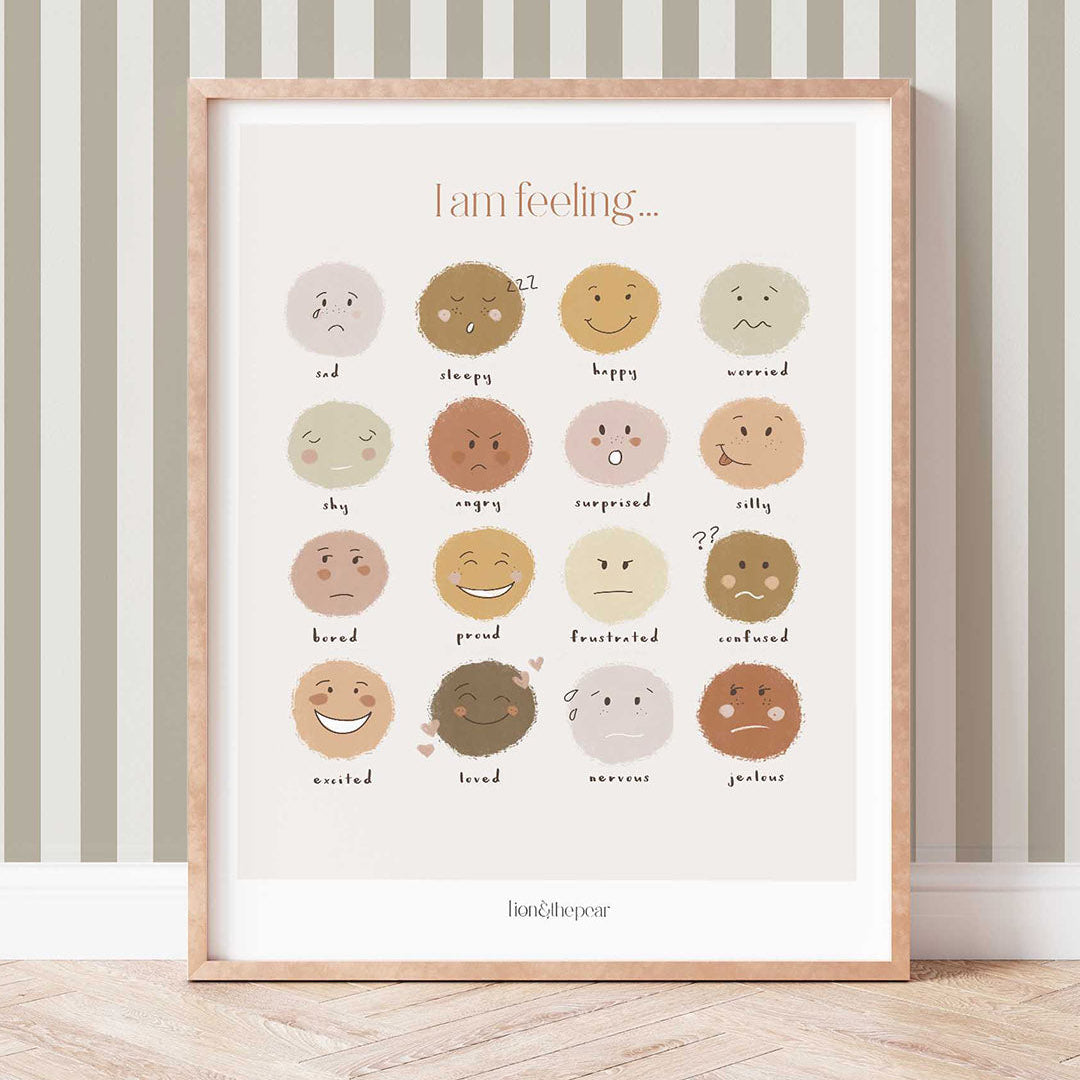 Ignite your child's creativity and learning with this big little feelings poster created in beautiful natural tonal hues and delightful characters, each face displaying a different emotion. A great piece to help toddlers to tweens understand the full range of human emotions. Printed on premium 250gsm paper, this enchanting poster is both a visual delight and a valuable educational tool.