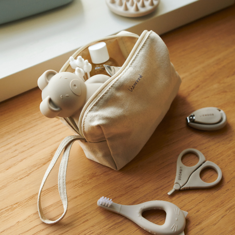 Pouch Shell: 100% Cotton, Pouch Zipper: 100% Metal, Massage Brush: 100% Silicone, Toothbrush bristles: 100% Nylon, Toothbrush handle: 100% Silicone, Scissor blades + clipper end blades: 100% Stainless Steel, Scissor handle + Clipper handle: 100% Recycled ABS, Outer shell thermometer: 100% Silicone.