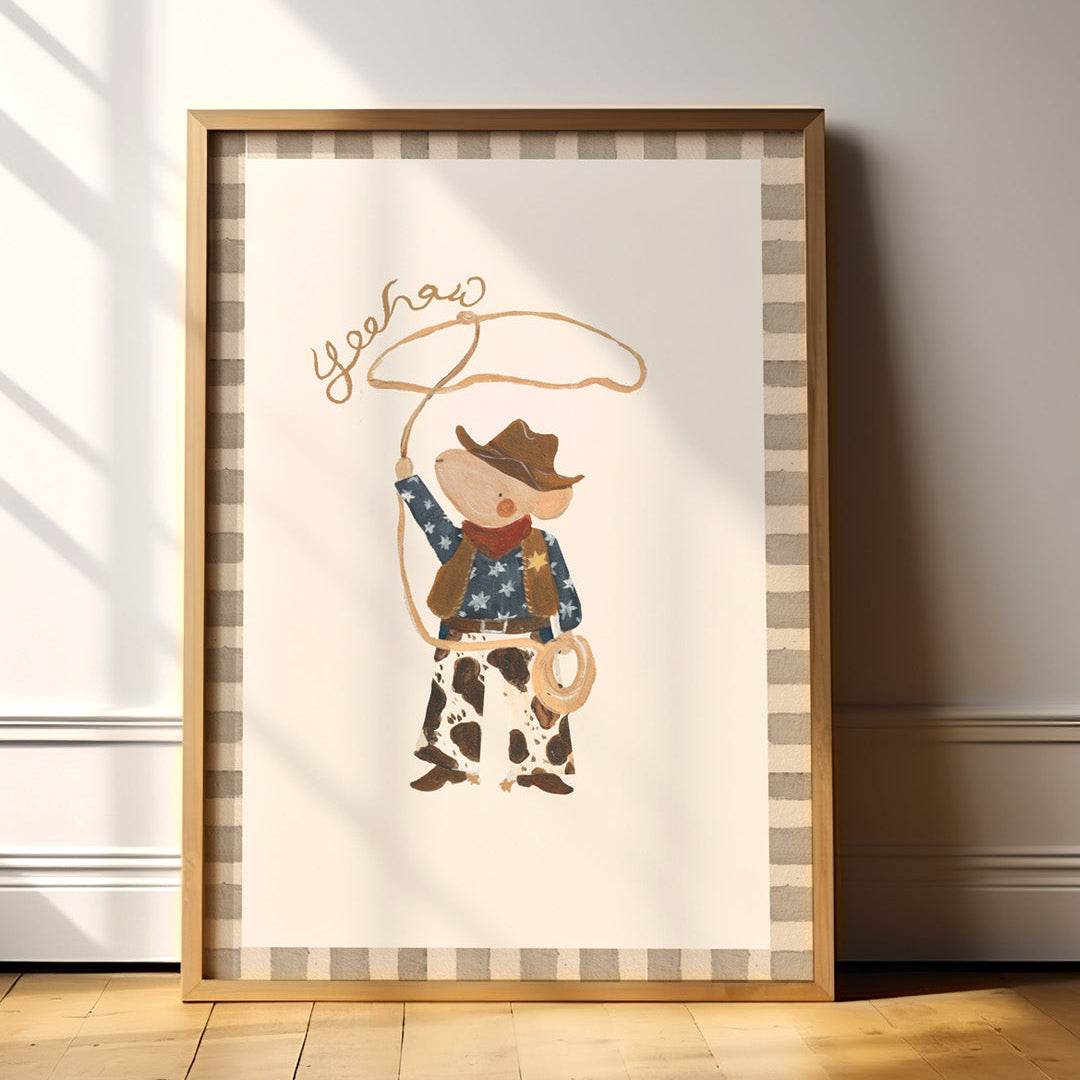 Ignite your child's creativity with this hand-painted Yeehaw Mouse cowboy print. Painted in Acrylic paint, bring a touch of the western to your little one’s room with this enchanting design featuring a mouse cowboy wearing a cow-print hat. Printed on premium 250gsm paper, this enchanting poster is a fun visual delight.