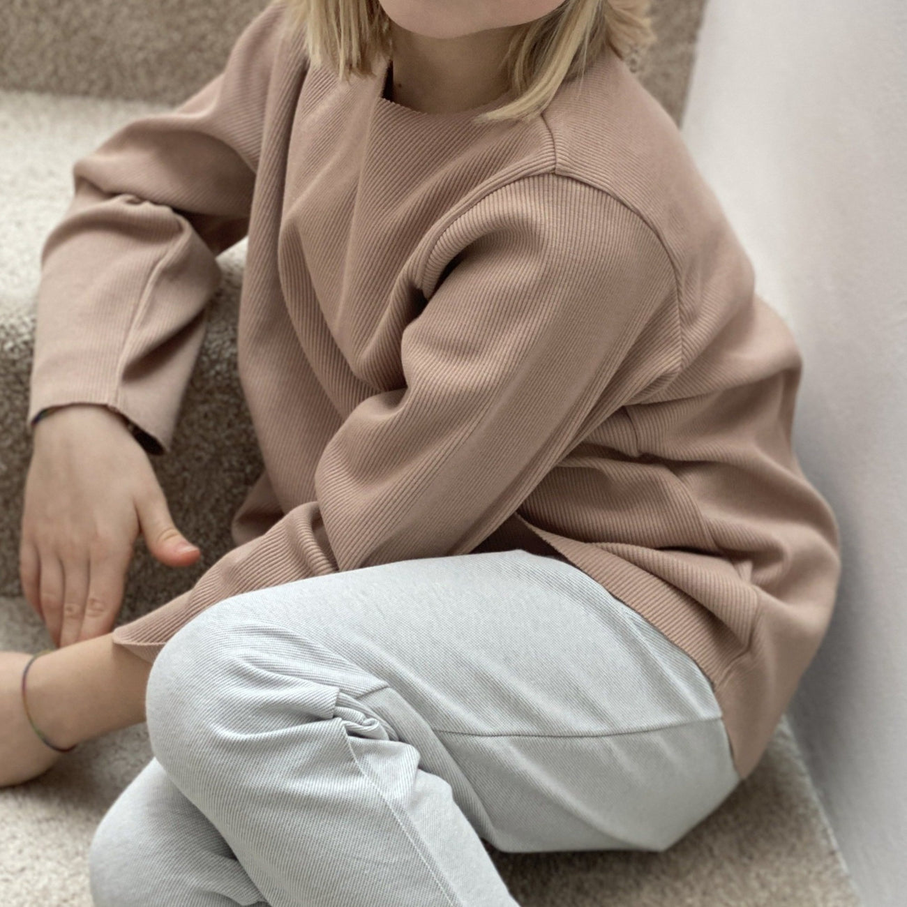 No logos, with all the style and comfort. This minimalist over-sized ribbed sweatshirt has a beautiful rib texture and feature raw edged hems - an effortless and easy choice for both playtime and lounging around in. Designed and made in Europe, this gorgeous brand focuses all their attention on keeping things simple, wearable and sustainable. Available in a wide range of sizes, from tiny baby to growing kids; easy, clean and minimalist dressing for all ages.