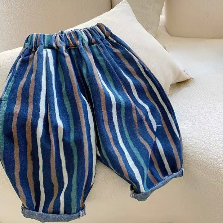 This playful pair of striped jeans are a stylish addition to your little one's look. Loose and baggy, a modern wide leg that slightly tapers at the ankle and has a comfortable wide elastic waistband. A roomy and non-restrictive style they're perfect for stylish kids always on the move. A versatile style, great for tucking in tops, speedy dressing and little ones to pull up themselves.