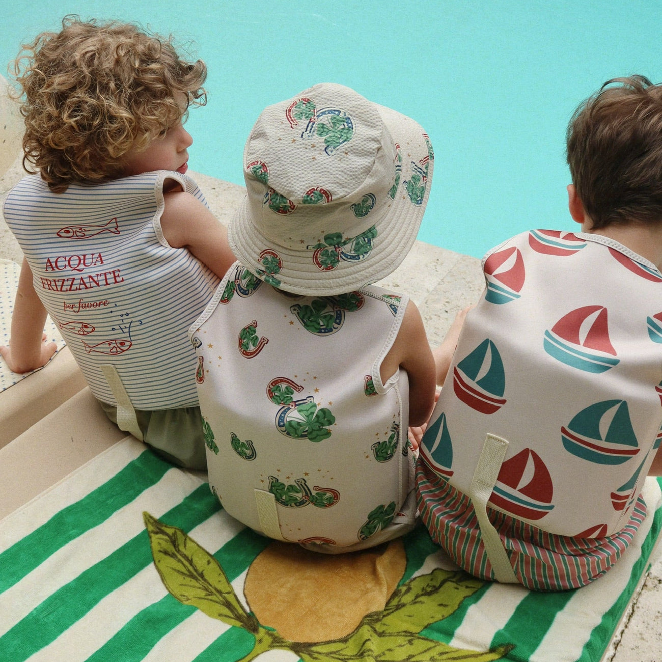 Our swim vests are designed with inside foam sticks that can be adjusted according to the child’s skills and needs. The float sticks can easily be removed one by one as your child develops their swimming skills. Always remove the sticks in pairs starting with 1 + 1, then 2 + 2 and so on until your child is completely adapted to swimming by themselves.