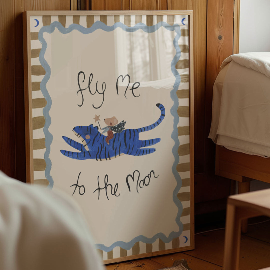 We love this hand painted Fly Me to the Moon Artwork, with scripted writing. Add a touch of whimsy to your child’s space with this dreamy art print featuring the mouse riding a blue tiger through the stars. With soft colours and a playful design, all painted in Acrylic paint. As perfect in the bedroom as the playroom - or any corner of the house