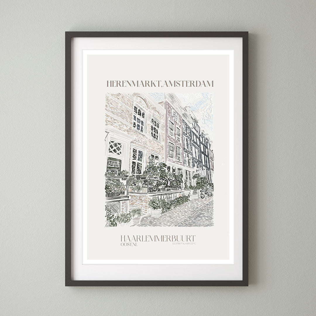 This hand-illustrated abstract print is created with pencil crayon, capturing cherished memories. This particular print shows the pictureque streets of Amsterdam, bring the essence of wanderlust to any corner of your home. The subdued tones lend a touch of sophistication, adding a timeless and elegant finish to your decor, printed onto velvet giclee 270gsm.