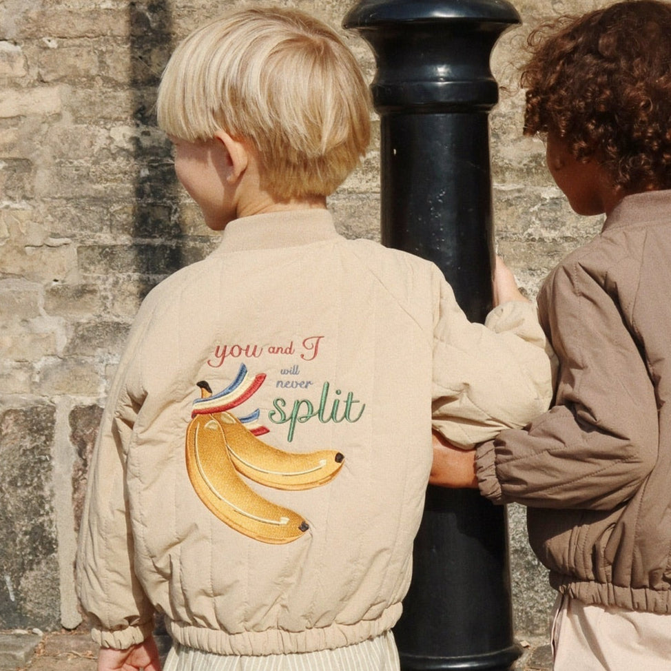 A forever favourite style, this effortless quilted bomber jacket is ideal for throw-on-and-go cool-kid style. Decorated with friendly bananas on the back and a small one on the front chest, this is a fun statement piece that'll add oodles of style to all kinds of looks. This Juno quilted bomber jacket is ideal for layering over a simple tee, oversized knit, or even over a summer dress. The elasticated collar has a varsity feel with a zip fastening as well as being both wind-resistant and water-repellent. The perfect outerwear piece in any little wardrobe.