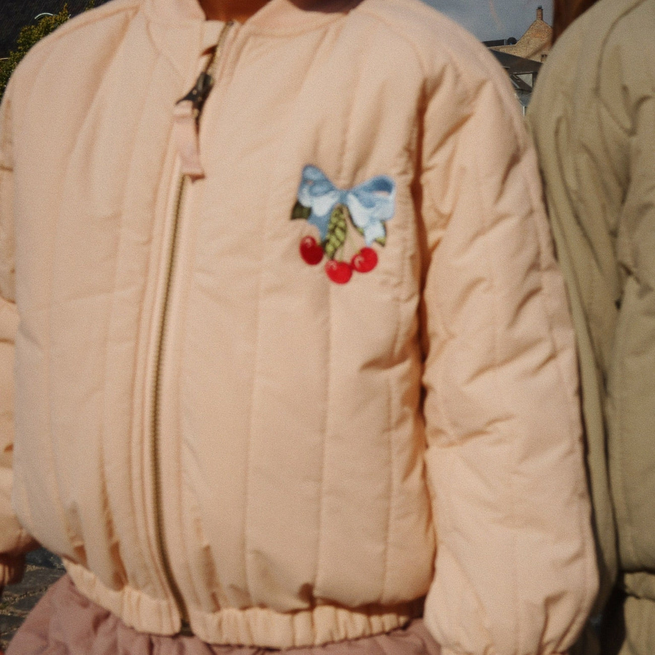 Juno Cherry Print Quilted Bomber Jacket (Cameo Rose)