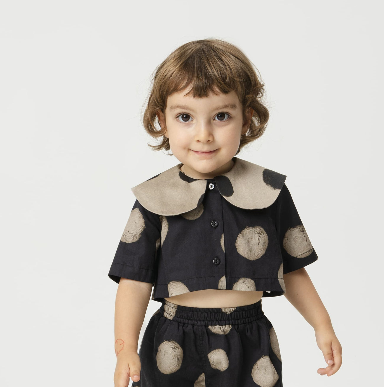Add more than a splash of print to your little ones look with this statement polka dot cropped shirt. We can't get enough of the large collar and cropped cut, the perfect cool-kid staple. The boxy and loose style is ideal for keeping cool and is an easy throw-on style for all-day comfort.