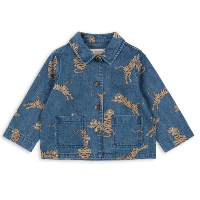 The ultimate cool kid style with the iconic Konges Slojd tiger print double denim trousers and jacket. The jacket is an oversized fit, and look so cute paired with the matching trousers. A staple style for simple and effortless dressing, this boxy denim jacket is a must-have for speedy style. Made from a soft cotton denim, wear with a simple white tee to make the tiger print pop. A true go-with-anything style!