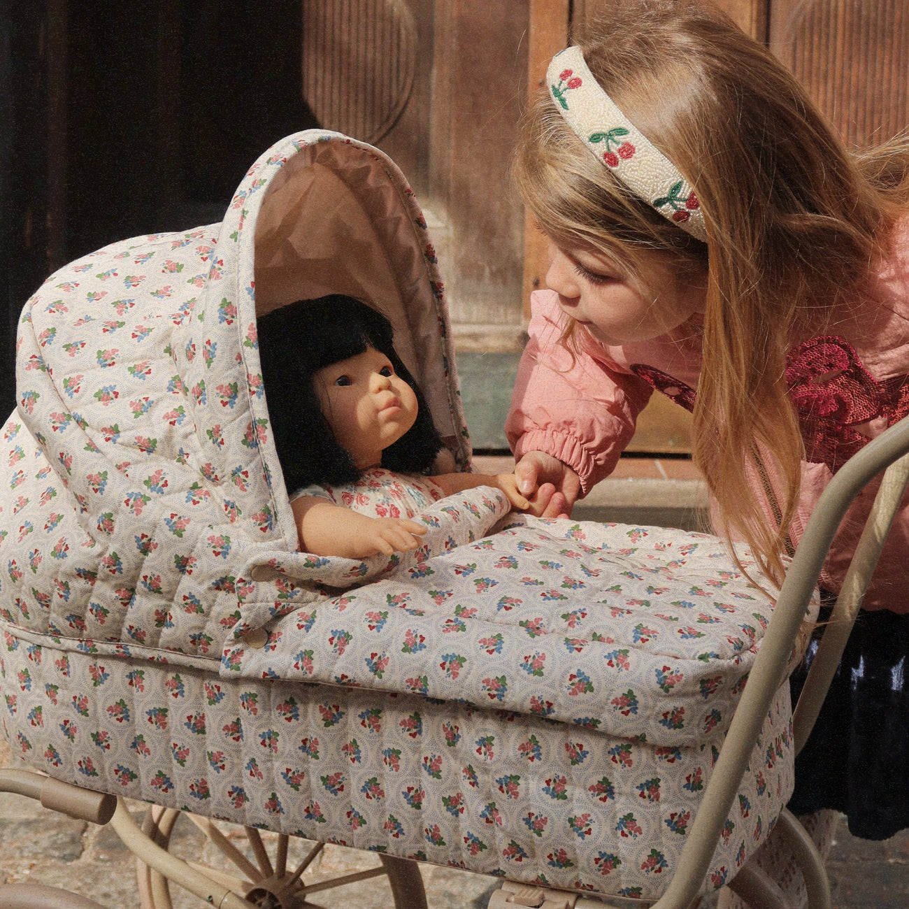 This miniature version of a traditional bassinet pram is a forever favourite in both style and as a toy. A must have for the nursery, as well as for trips out to the park and to get little ones walking! It has four smooth wheels and a EVA grip handle, as well as a storage section on the bottom and a hanging bag to stash any doll accessories. Made to the highest quality it's the perfect heirloom piece to pass on to others once outgrown.