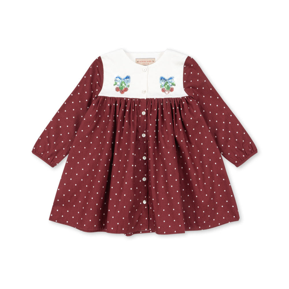 Made from a soft woven organic cotton, this style-must-have polkadot dress has beautiful mother of pearl buttons that run down the front, as well as on the cuffs. We love the super cute cherry sequinned motifs on the front, and the smocked high neck for a classic and timeless look. Easy to dress up for special occasions or keep casual for the everyday. We just wish we had an adult size!