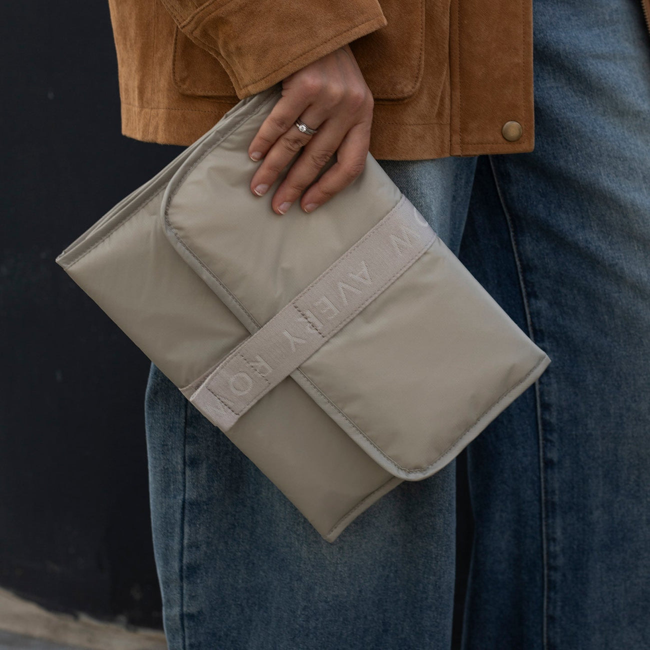 The Avery Row baby travel changing mat, a lightweight, portable and stylish essential for modern parenting. Made from recycled, water-resistant materials with a soft quilted finish, this compact changing mat is both eco-conscious and practical. Made from a wipe-clean water resistant fabric, with a velcro closure for fast one-handed access and a handy fold-out pocket to store nappies and wipes on the go.