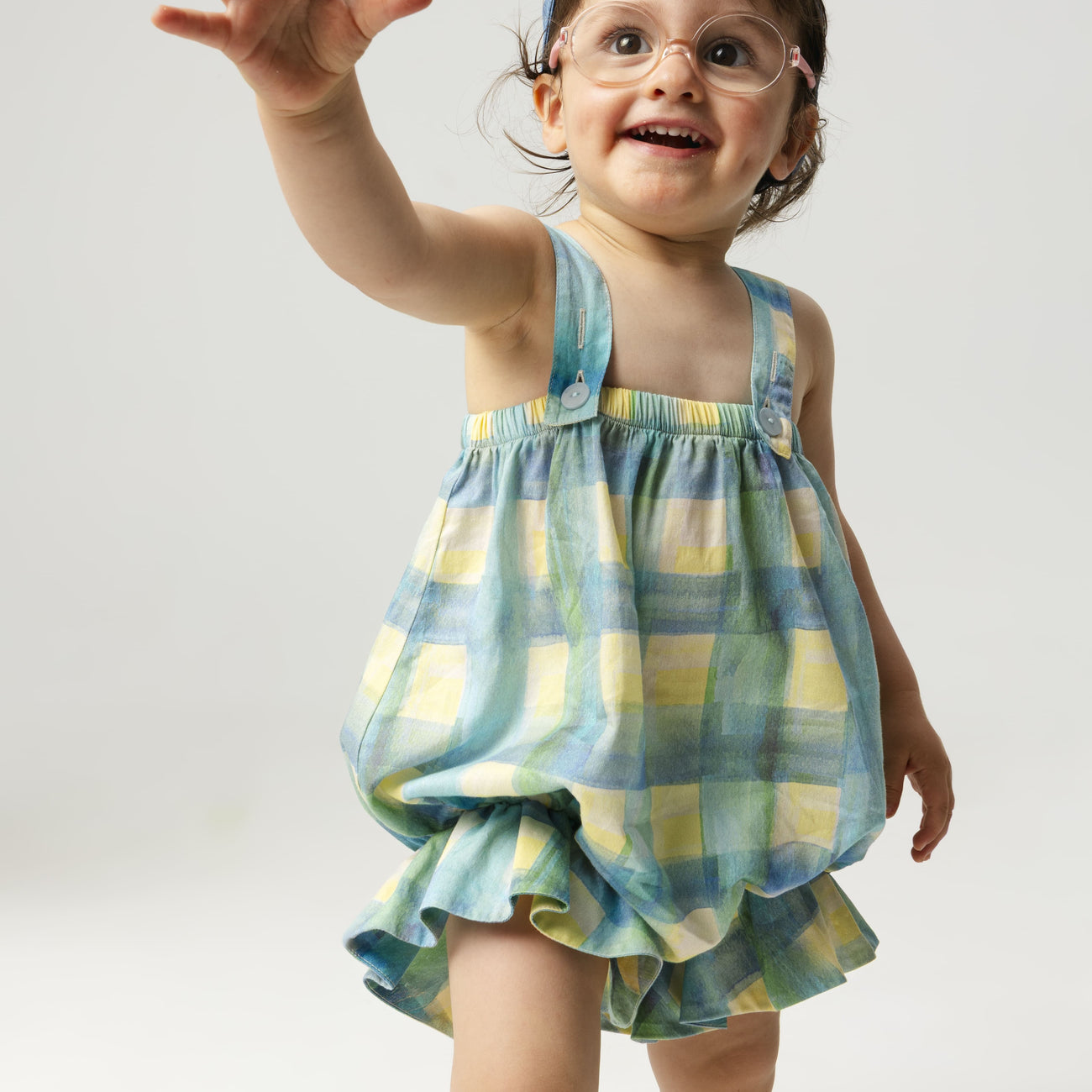This statement little romper is made from checked woven cotton and comes with adjustable straps and button fastenings. The top of the legs feature a unique frill design. Perfect for both special occasions and day wear, for baby boys and baby girls.