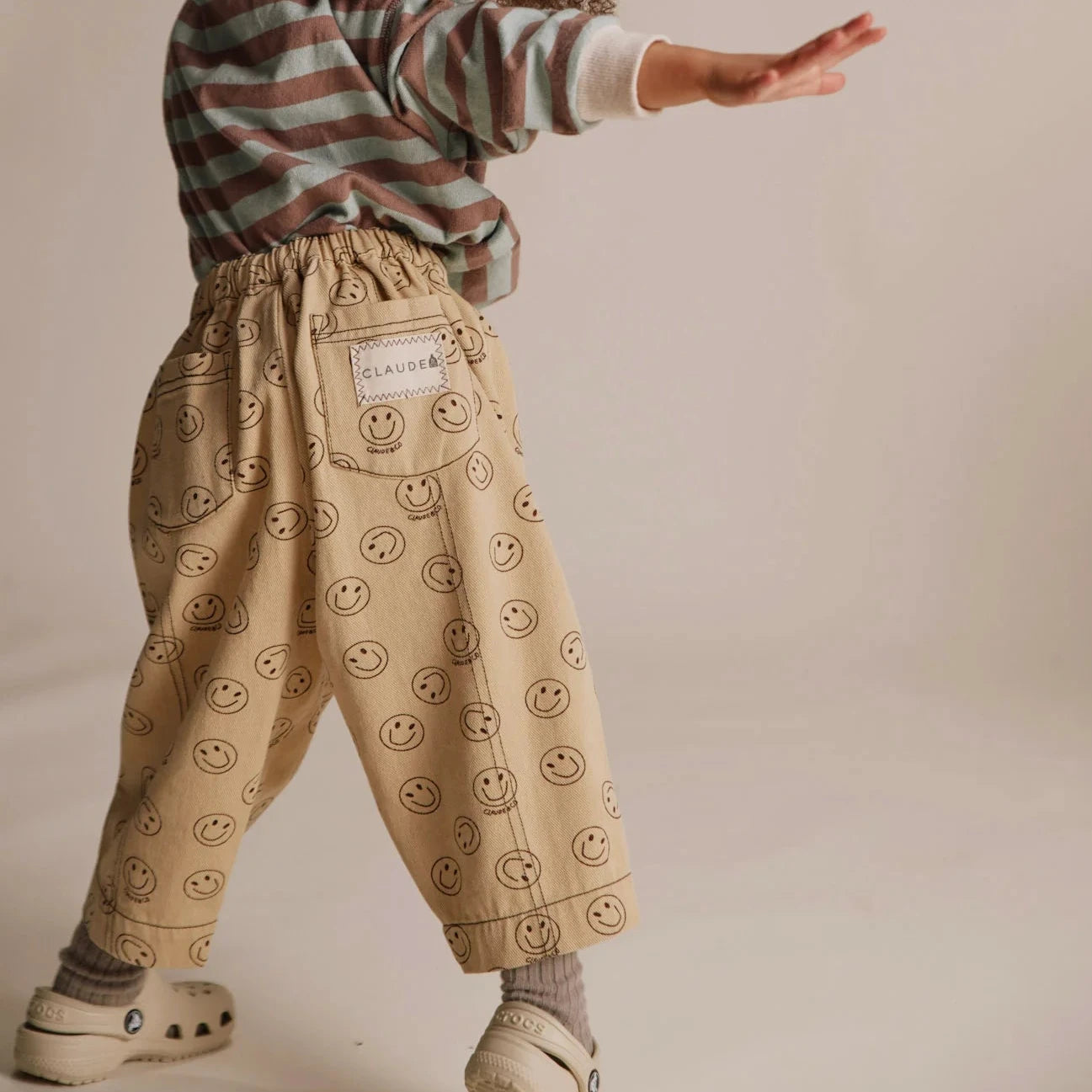 A playful happy face print in a neutral butter shade, these trousers are the perfect addition to add to your child’s wardrobe. A wide baggy oversized fit in Organic Cotton will mean ultimate comfort whilst they explore for the day. Let the trousers do all the talking and team with neutrals or contrasting colours.