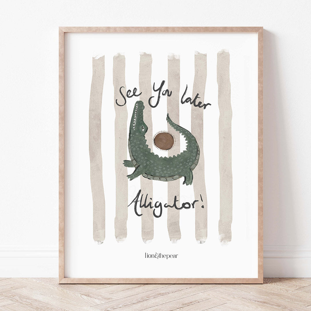 We love this super cute hand-painted Alligator print, perfect for those animal-themed rooms, adding a touch of fun to their spaces. Painted in Acrylic paint on a neutral striped background quoting 'See you later alligator.' featuring a charming little alligator character.