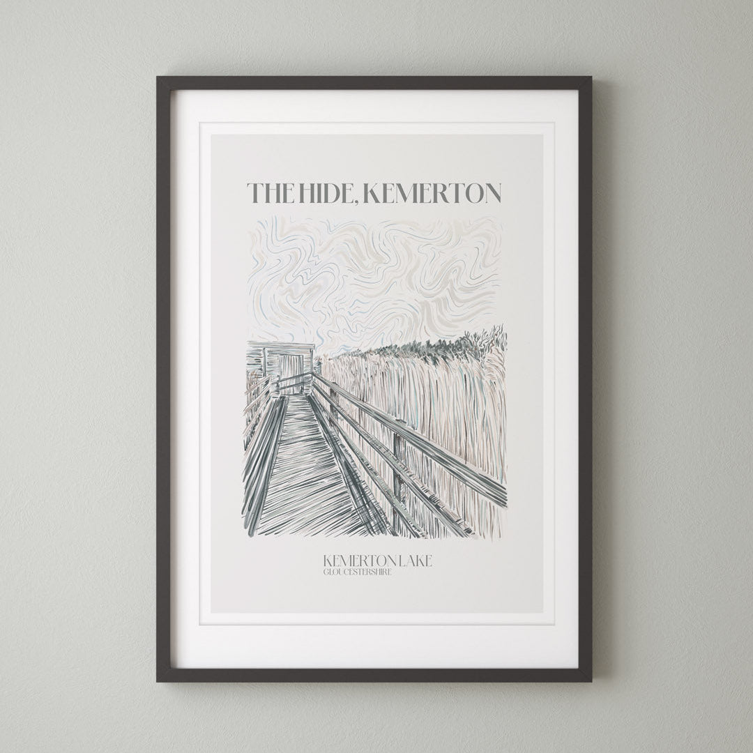 This hand-illustrated abstract print is created with pencil crayon, capturing cherished memories. This particular print shows the serene Hide at Kemmerton Lakes, bring the essence of wanderlust to any corner of your home. The subdued tones lend a touch of sophistication, adding a timeless and elegant finish to your decor, printed onto velvet giclee 270gsm.