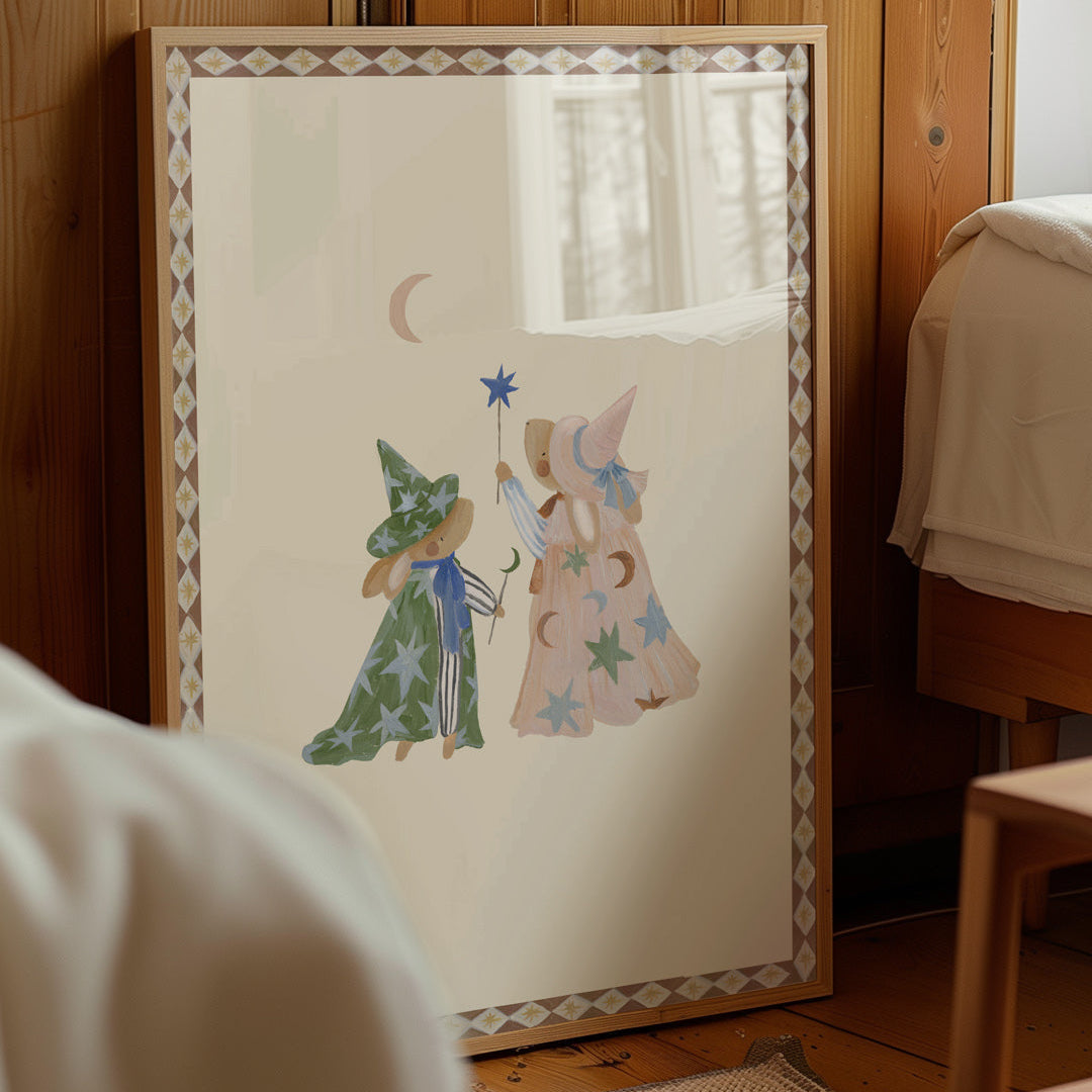 Bring a touch of magic to your little one’s room with this hand-painted wizards and witches print. Painted in Acrylic this enchanting design features two sweet bunny friends or siblings dressed as whimsical wizards under a pink moon on a neutral background with a Scandi inspired boarder. Add a little magic and adventure to your child's room or playroom, this print will go perfectly in any magical themde room.